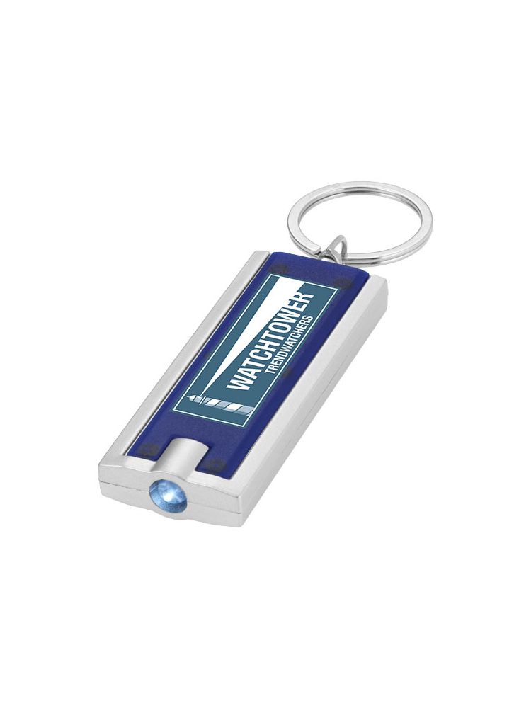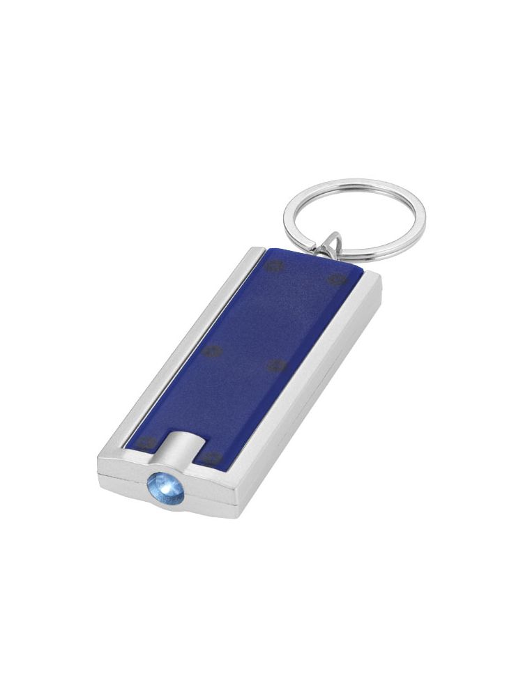Brelok z białą diodą LED, włączany przyciskiem. Metalowe kółko do kluczy. Baterie w zestawie.