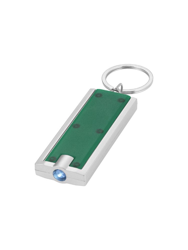 Brelok z białą diodą LED, włączany przyciskiem. Metalowe kółko do kluczy. Baterie w zestawie.