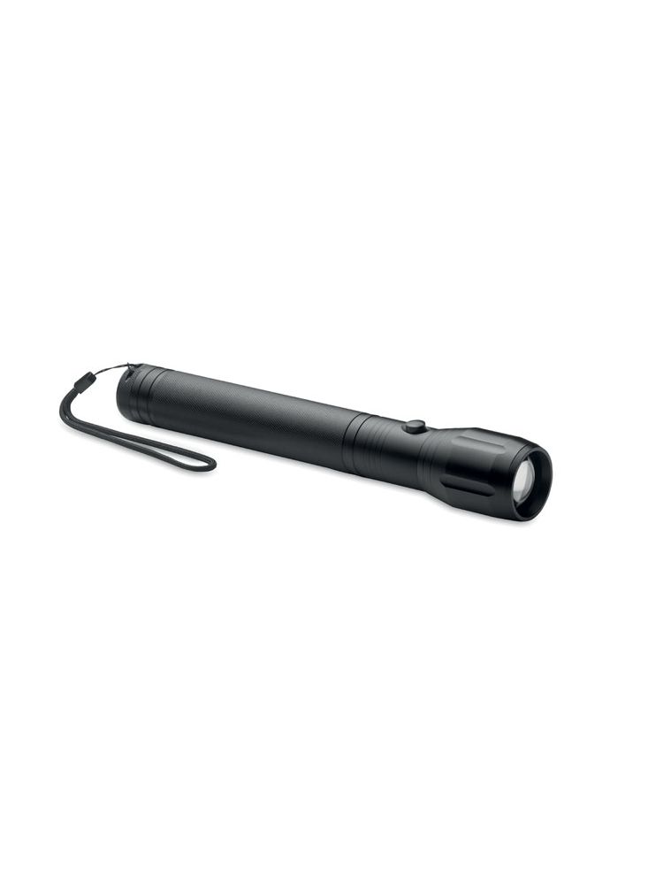 Duża aluminiowa latarka z 1 diodą LED, z możliwością powiększenia i z odczepianym paskiem. Moc światła: 300 lumenów. 3 baterie D nie są dołączone.