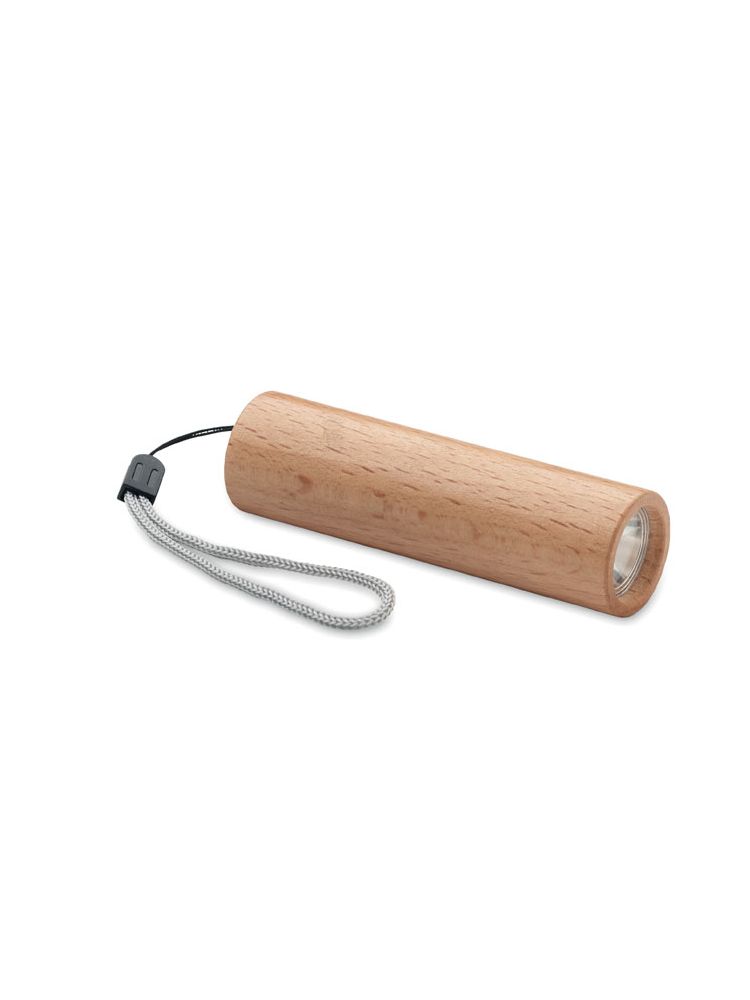 Latarka akumulatorowa z drewna bukowego ze światłem 5W 70 LUM (1 LED). 3 ustawienia światła i pasek do przenoszenia. Dołączony akumulator 300 mAh.