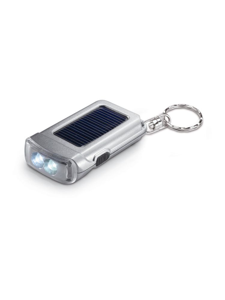 Satynowy srebrny breloczek do kluczy z latarką na baterię słoneczną. 2 białe światła LED.