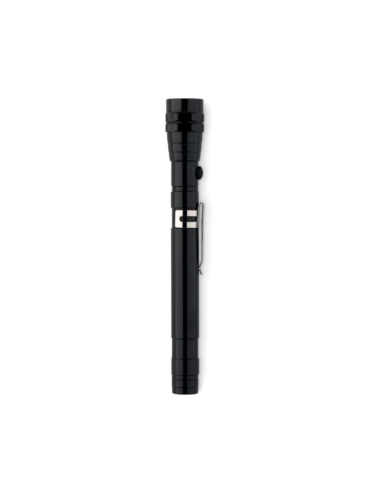 Teleskopowa, aluminiowa latarka z 3 diodami LED, magnesem na głowicy oraz klipem umieszczonym z boku. Max. dł. 57cm. Dołączone 4 baterie LR44.