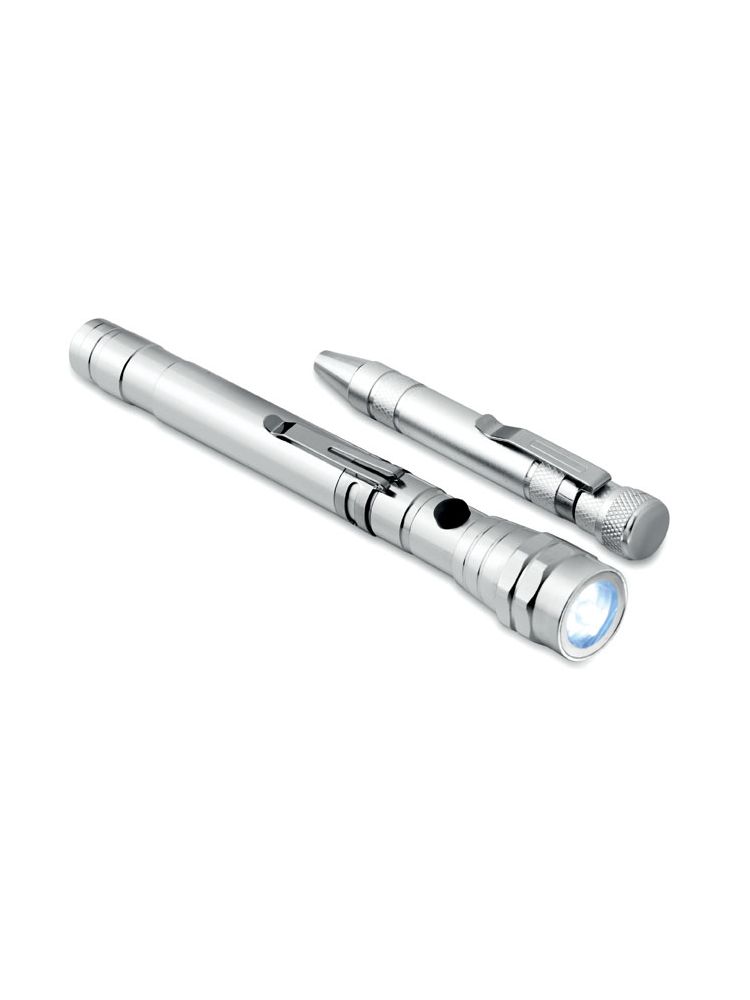 Zestaw narzędzi: aluminiowa latarka z możliwością wydłużania z 3 diodami Led oraz narzędzie wielofunkcyjne w kształcie długopisu, wyposażone w 8 końcówek. 4 baterie LR44 dołączone. Pakowany w pudełko.