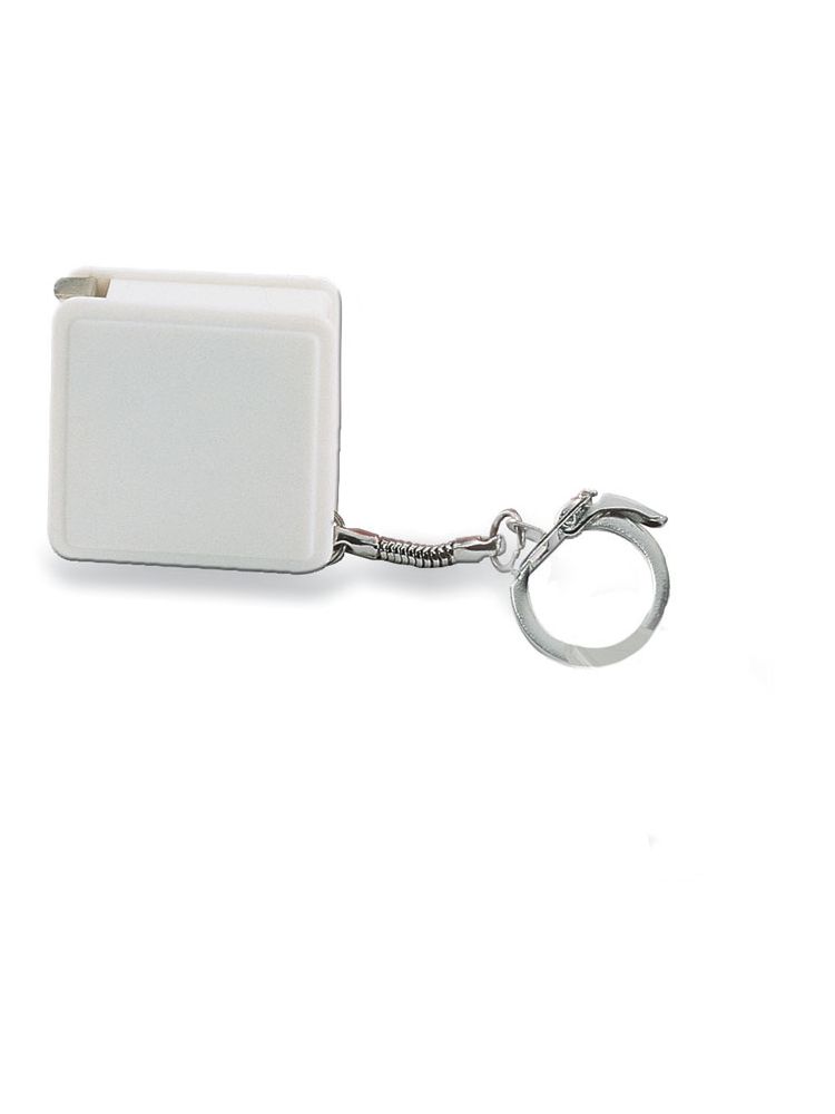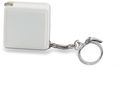 Kwadratowa stalowa miarka z brelokiem. Długość: 1 metr. Plastikowa obudowa.
