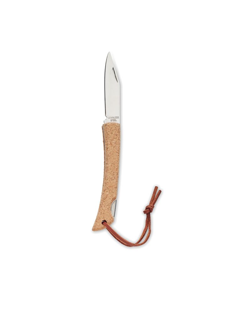 Składany nóż ze stali nierdzewnej, z rękojeścią pokrytą korkiem i z linką z PU. Korek jest materiałem w 100% naturalnym. Ze względu na jego strukturę i porowatość powierzchni ostateczny wygląd nadruku na każdym artykule może się różnić.