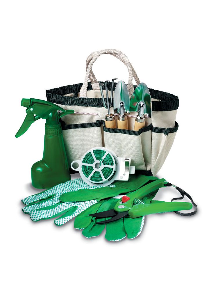 Komplet 7 narzędzi ogrodniczych w torbie. 2 łopatki, spryskiwacz, grabki, rękawiczki, drut i nożyczki w torbie.