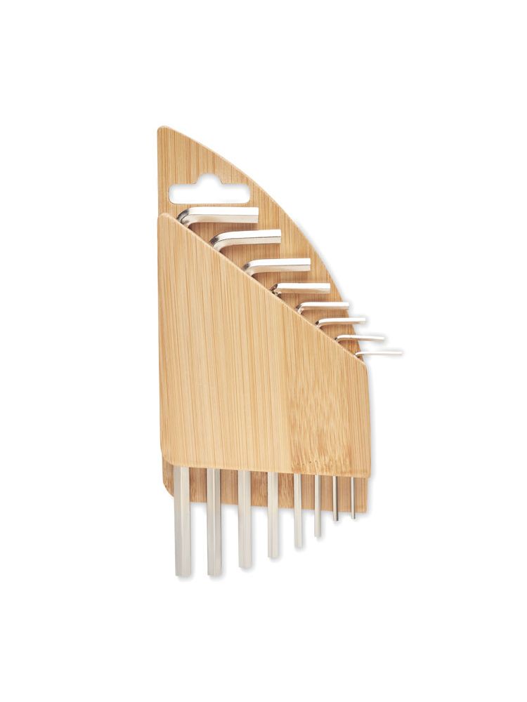 Zestaw kluczy sześciokątnych, imbusowych, w bambusowym uchwycie. Zawiera klucz sześciokątny ze stali węglowej z powłoką niklową o następujących rozmiarach: 1 ,5mm – 2mm – 2,5mm – 3mm – 4mm – 5mm – 5,5mm – 6mm. Bambus jest produktem naturalnym, dlatego mogą wystąpić nieznaczne różnice w kolorze, wzorze i rozmiarze.