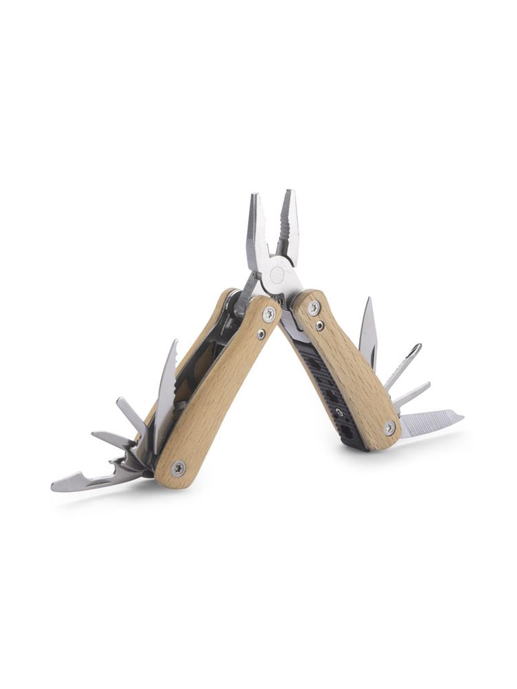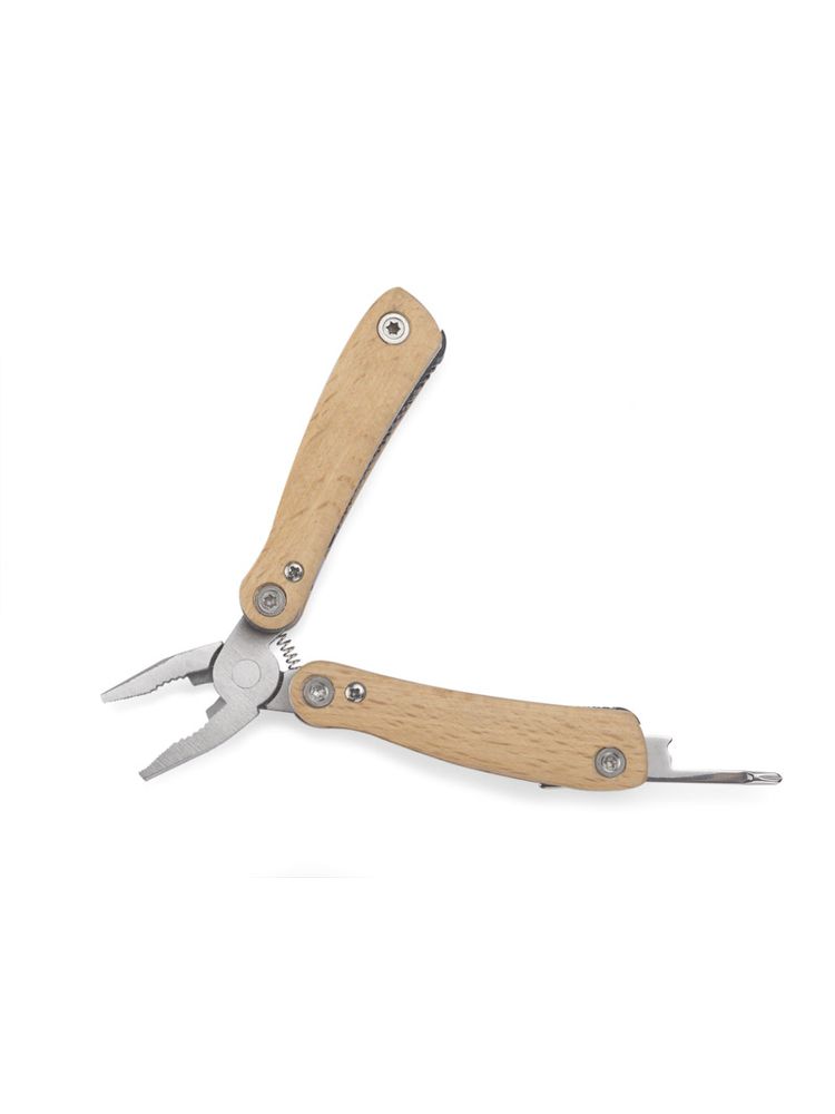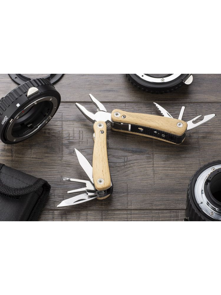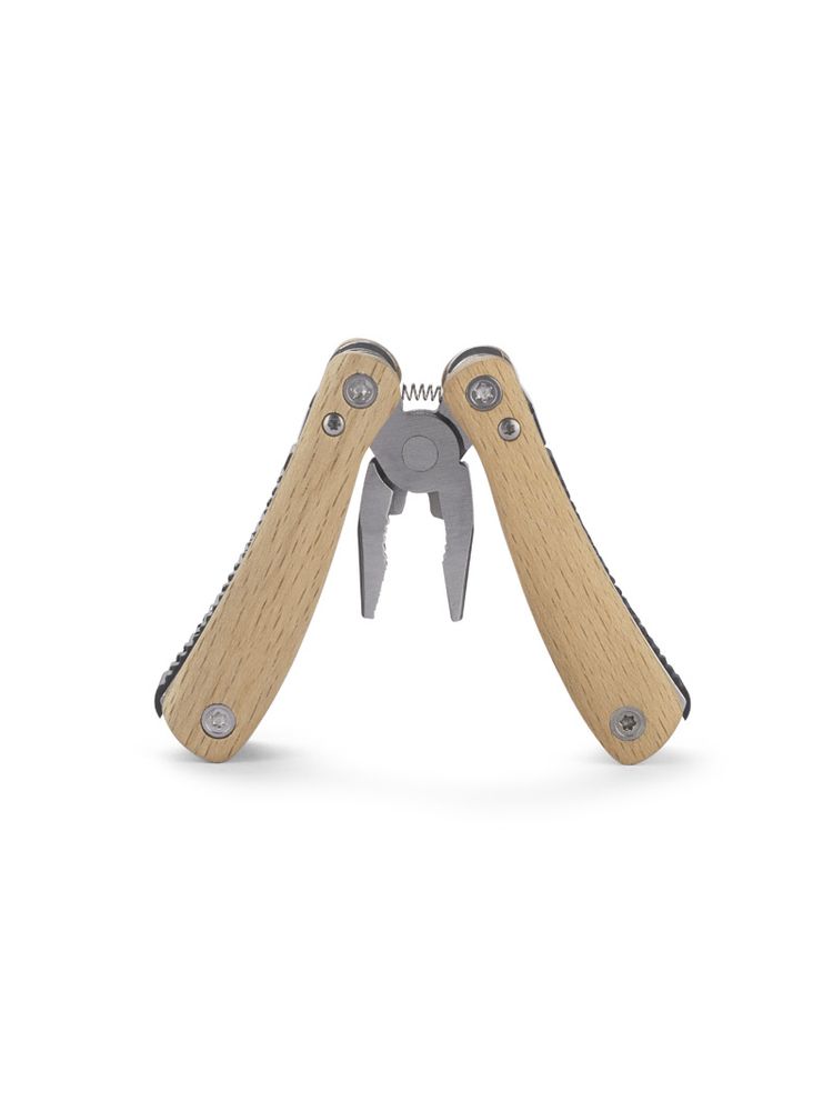 Narzędzie wielofunkcyjne FORT to gadżet w kieszonkowym rozmiarze, wykończony drewnem. Funkcje: kombinerki, przecinak, nóż, śrubokręt płaski i krzyżowy, pilnik, piła, otwieracz do butelek i puszek. W komplecie znajduje się również czarny, materiałowy pokrowiec na narzędzie.