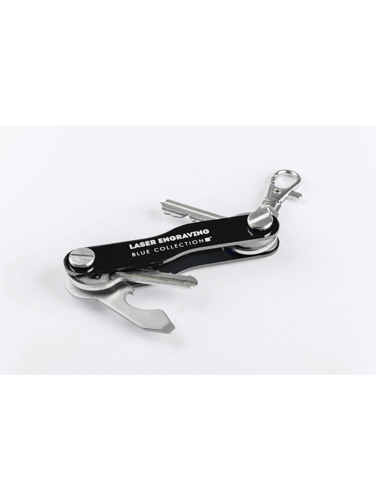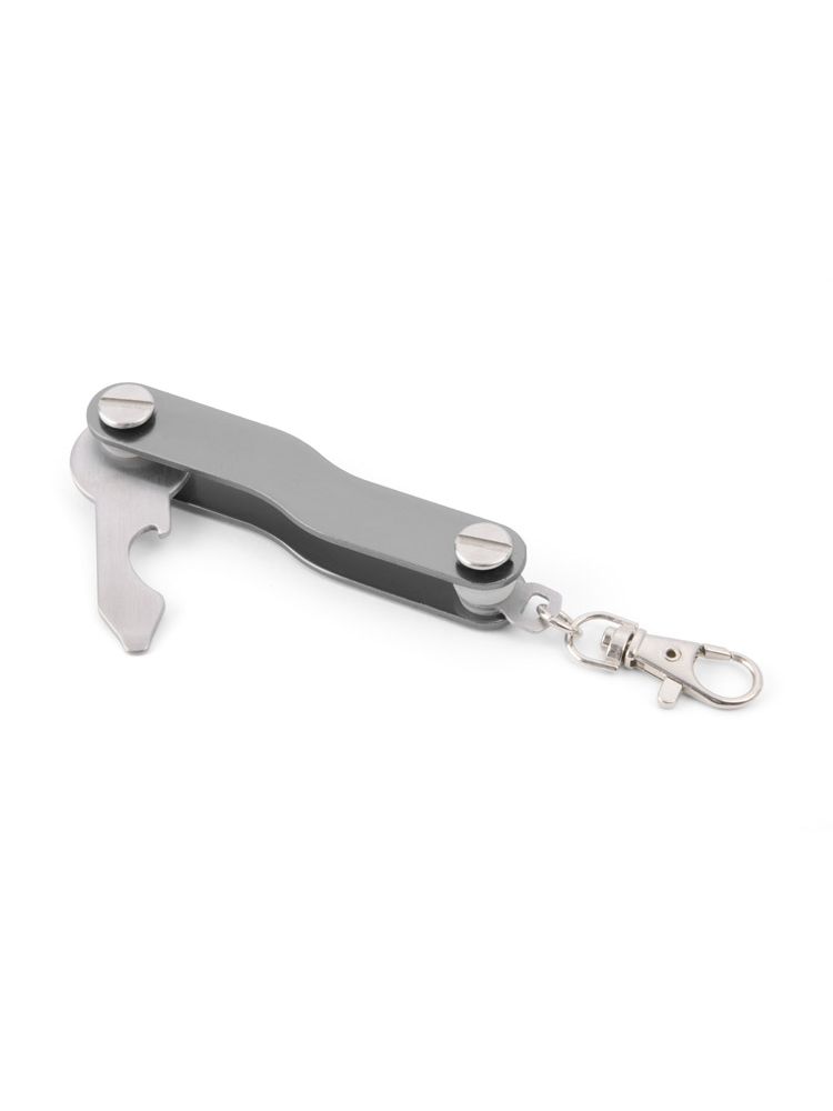 Ten gadżet pomaga doskonale zorganizować i sprytnie spakować klucze do rozmiarów scyzoryka. Jego ergonomiczny kształt poprawia komfort noszenia w kieszeni czy też zmniejsza ryzyko porysowania innych rzeczy w damskiej torebce. Karabińczyk m.in. pozwala na dołączenie większych kluczy np. do samochodu. Dodatkowo w zestawie znajduje się specjalny klucz zwiększający funkcjonalność organizera o płaski śrubokręt oraz otwieracz do butelek. Pasuje do większości rodzajów domowych kluczy wyposażonych w otwór u szczytu.