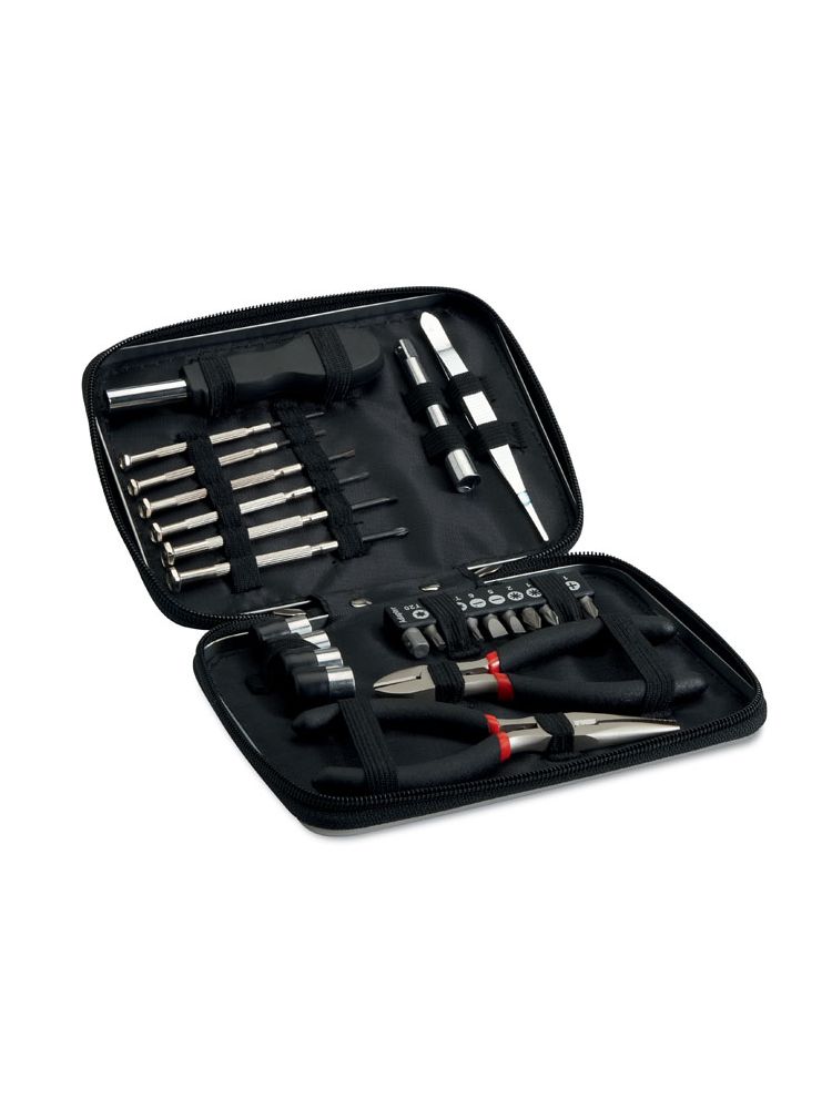 Zestaw narzędzi w aluminiowym etui. Posiada kombinerki, klucze nasadowe.
