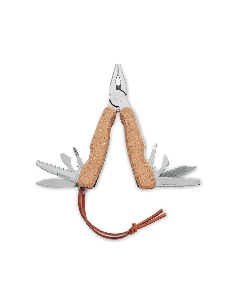Wielofunkcyjny scyzoryk ze stali nierdzewnej z korkowym wykończeniem rękojeści i ze sznurkiem z PU. 9 funkcji. Korek jest materiałem w 100% naturalnym. Ze względu na jego strukturę i porowatość powierzchni ostateczny wygląd nadruku na każdym artykule może się różnić.