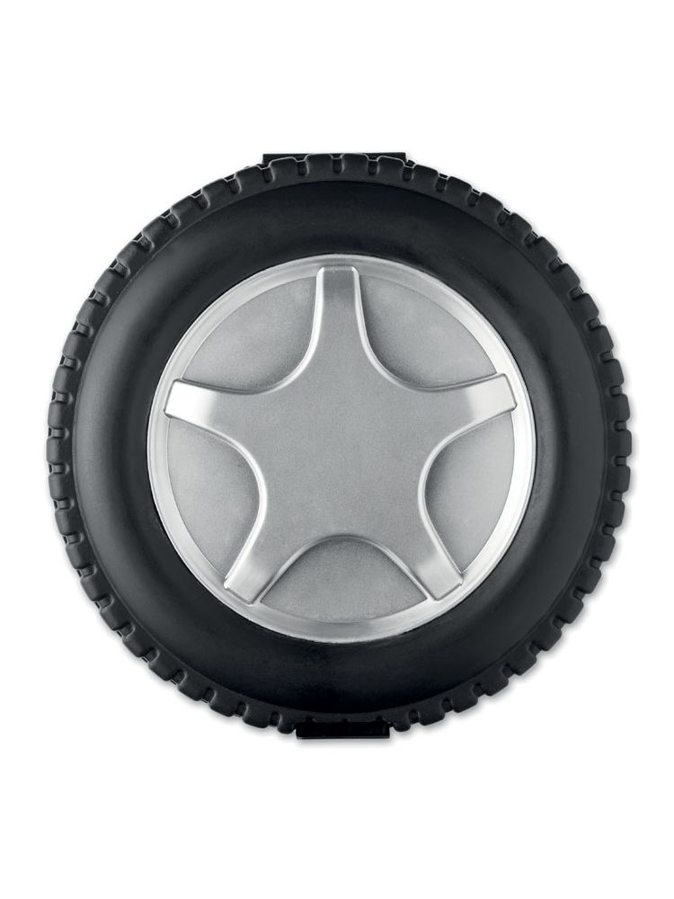 Zestaw narzędzi w opakowaniu w kształcie opony. 25 sztuk: przedłużacz, śrubokręt nasadowy, kombinerki, 5 nasadek, 3 klucze sześciokątne, 10 końcówek, 2 śrubokręty precyzyjne i taśma.