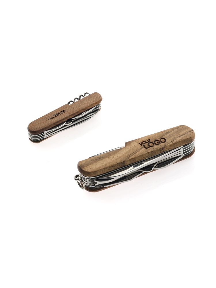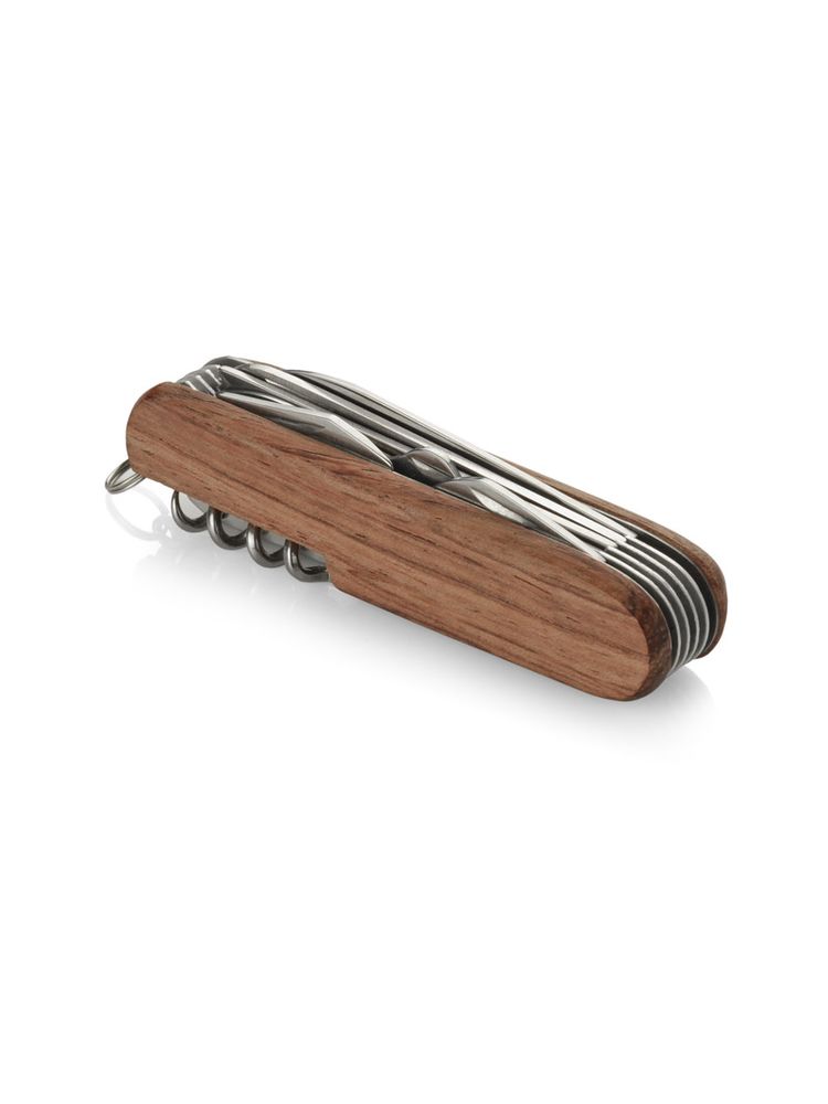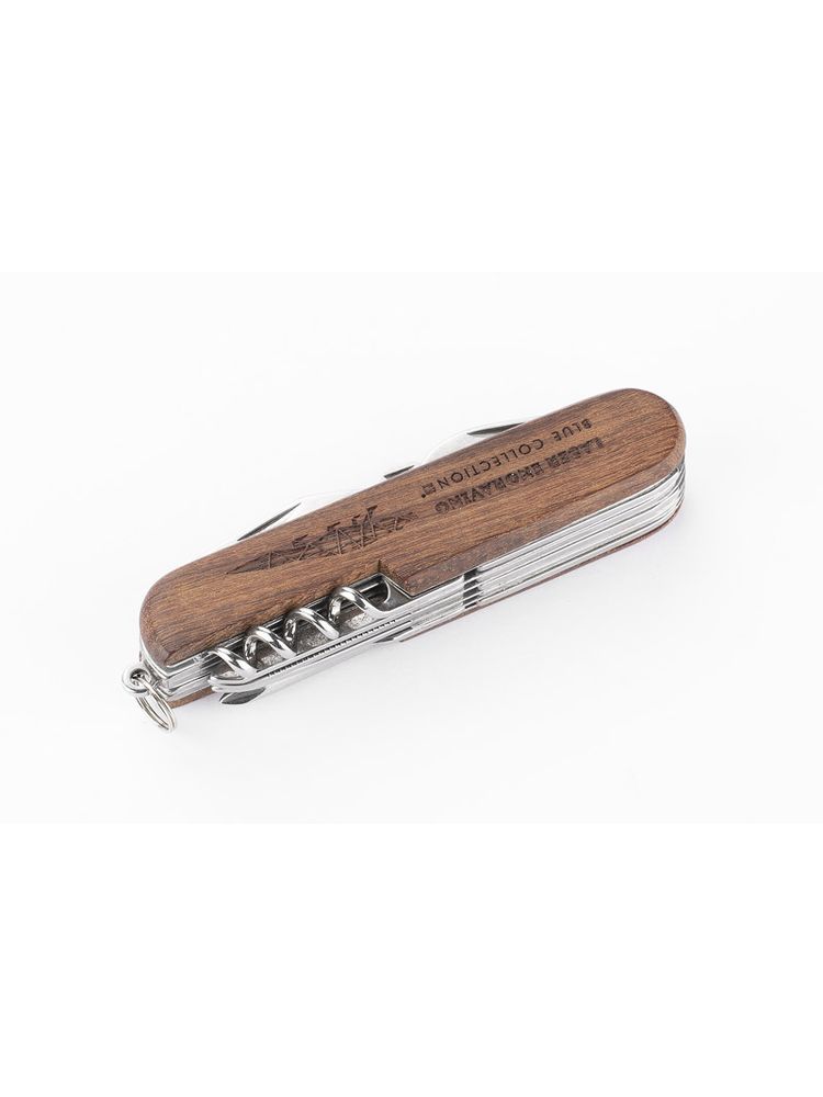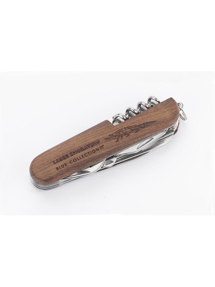 Scyzoryk z rączką wykończoną drewnem, która nadaje mu wyjątkowy charakter i piękny wygląd. Scyzoryk posiada wszystkie niezbędne funkcje: nóż, piła, skrobak do ryb, nożyczki, otwieracz do puszek, otwieracz do butelek, śrubokręt, korkociąg, szydło oraz dziurkacz do skór.