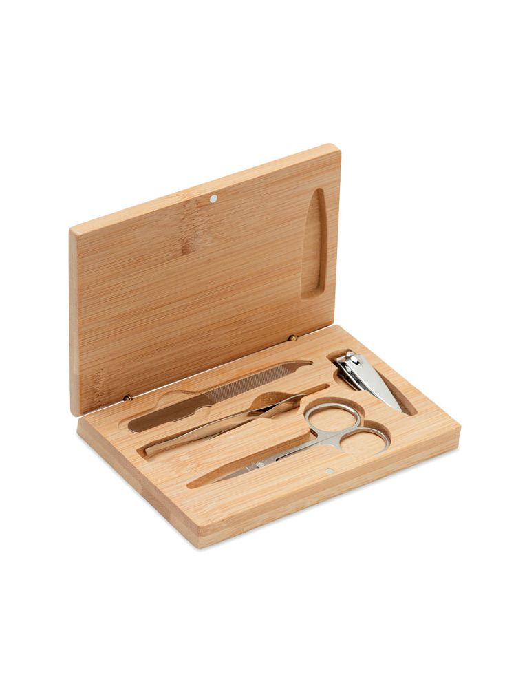4-elementowy zestaw do manicure ze stali nierdzewnej, w bambusowym etui z magnetycznym zamknięciem. Zawiera: zakrzywione nożyczki do paznokci, obcinacz do paznokci, pilnik do paznokci i pęsetę. Bambus jest produktem naturalnym, dlatego mogą wystąpić nieznaczne różnice w kolorze, wzorze i rozmiarze.