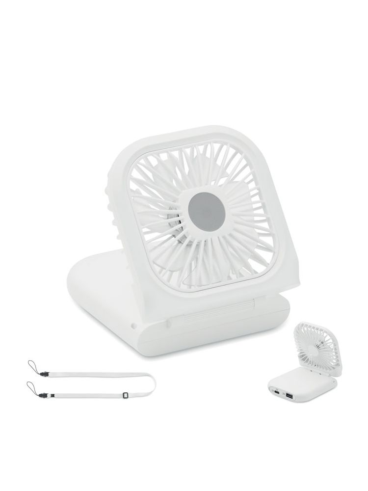 Przenośny składany wentylator z regulowanym paskiem na szyję. 3 ustawienia prędkości. Może być również używany jako wentylator biurkowy po złożeniu. Zawiera 3000 mAh power bank. Wejscie/Wyjście: Typ-C & wyjście typ A.