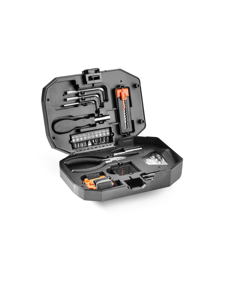 Wielofunkcyjny zestaw narzędzi ETI skrywa swoją funkcjonalność w środku latarki. W jej wnętrzu znajdują się wszystkie najpotrzebniejsze narzędzia takie jak: śrubokręt z zestawem wymiennych bitów, 3 klucze imbusowe, wysuwany nożyk, dwa śrubokręty precyzyjne, miarka oraz kombinerki. Najciekawszym elementem zestawu jest lampka z dwoma trybami świecenia, którą można używać jako lampki stacjonarnej wyciągając rozkładane ramię. Dodatkowo lampkę można odczepić od podstawy i przymocować na zawartym w zestawie pasku, otrzymując w ten sposób wygodną czołówkę.