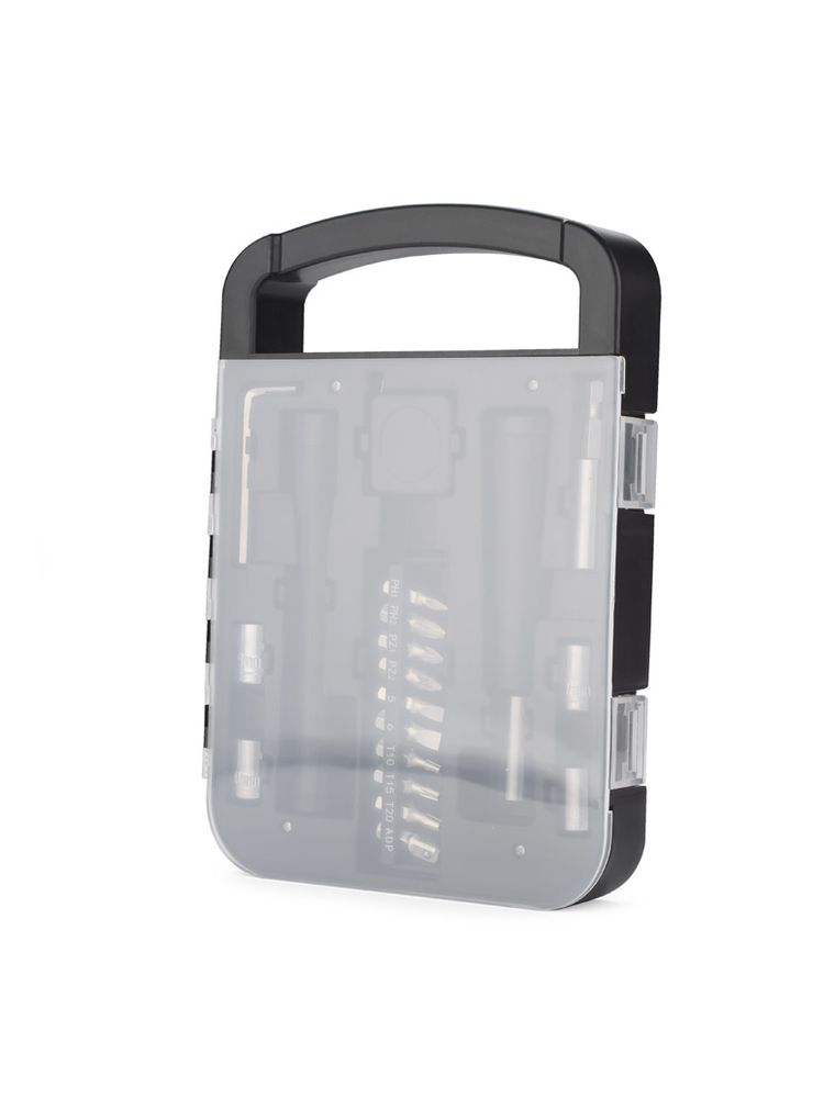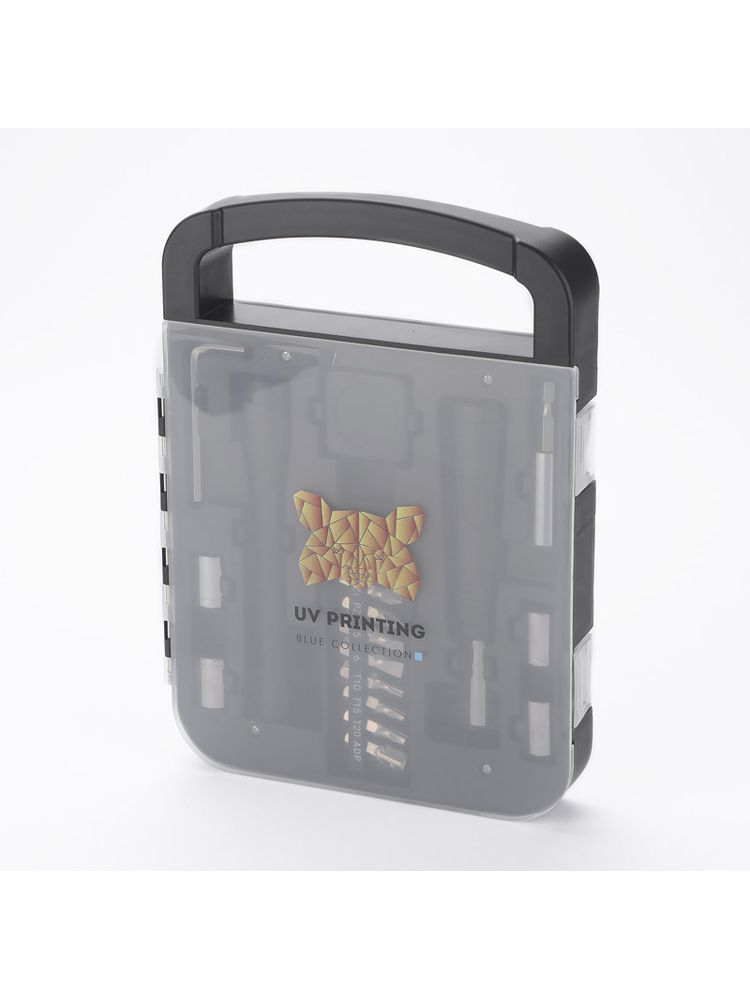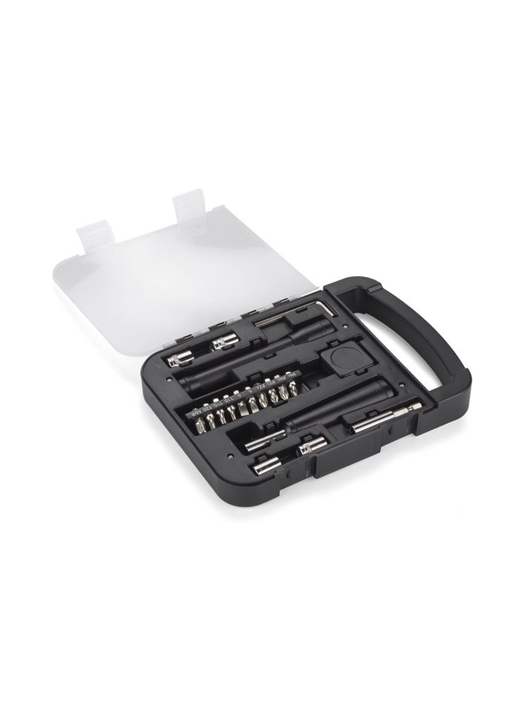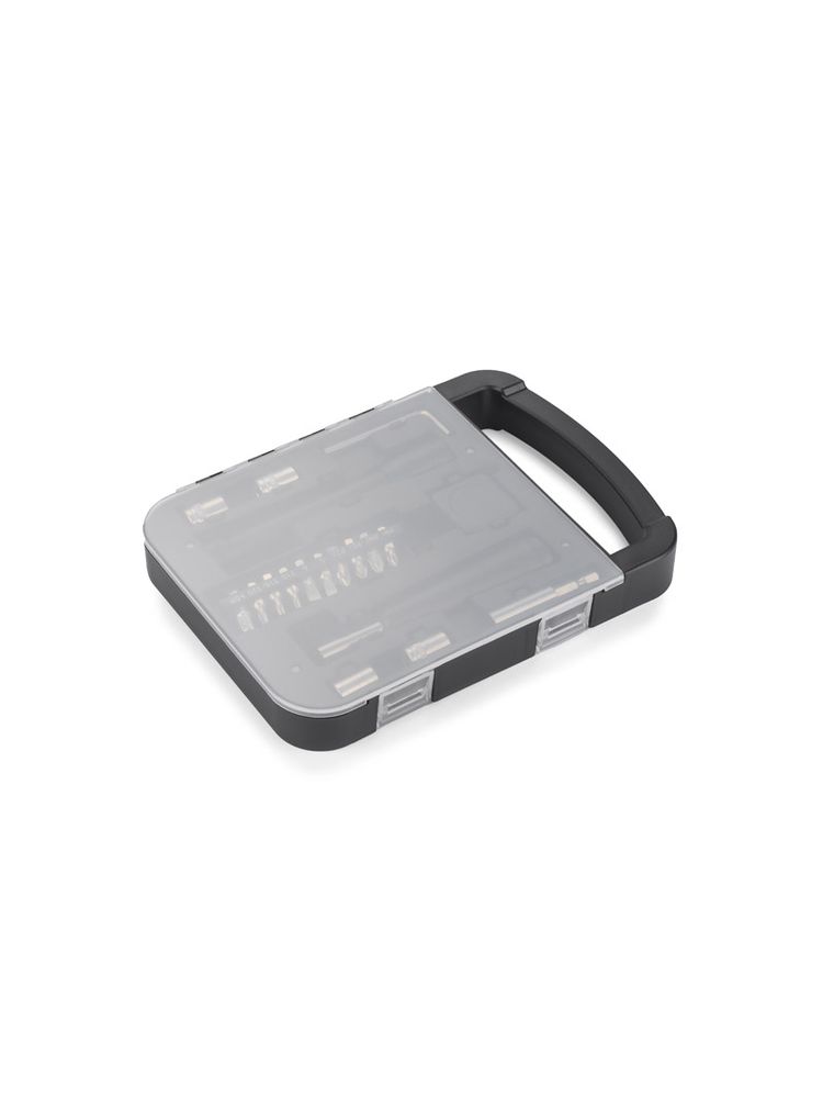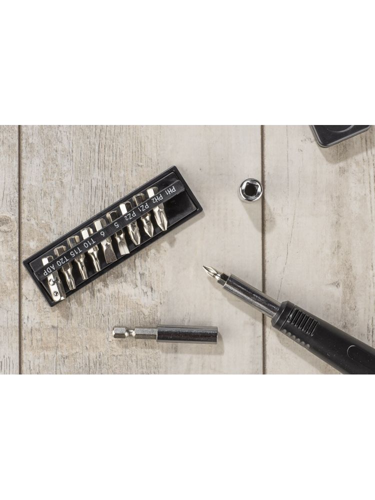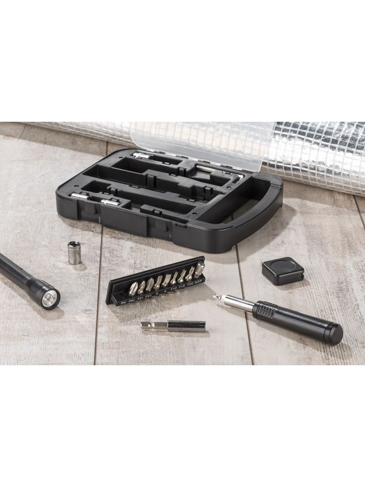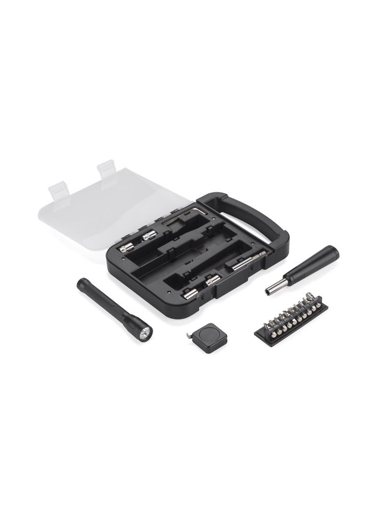 FIXO to zestaw narzędzi w praktycznej obudowie. Wewnątrz znajdują się: klucz imbusowy, latarka, miara, wkrętak, dziesięć różnych bitów, przedłużka i cztery końcówki nasadowe 7mm, 8mm, 9mm i 10mm.