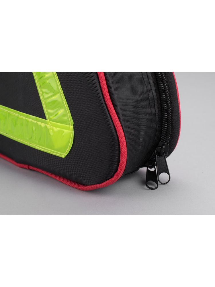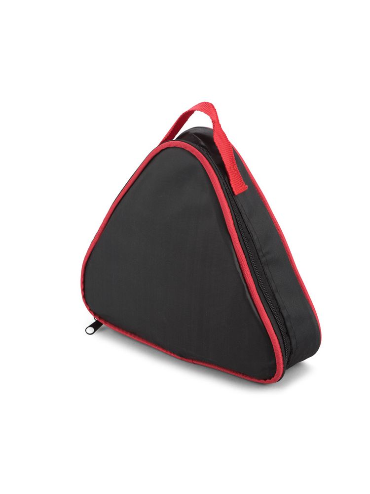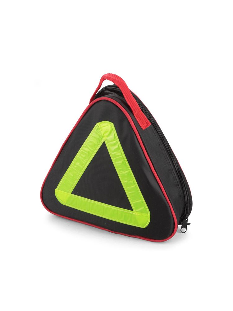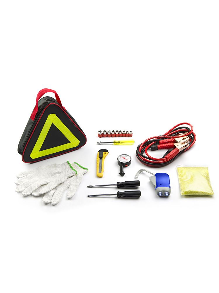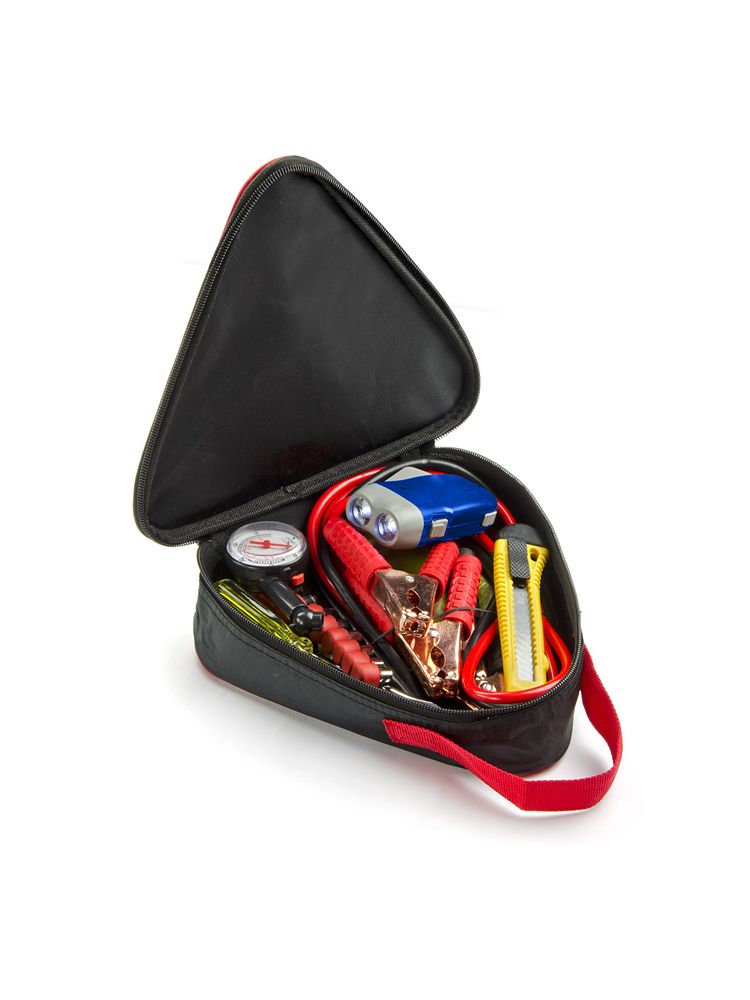 Zestaw narzędzi samochodowych umieszczony w torbie z poliestru, która dzięki swojemu kształtowi może zostać wykorzystana jako trójkąt ostrzegawczy. Zestaw zawiera: kable do ładowania akumulatora, przyrząd do pomiaru ciśnienia opon, komplet śrubokrętów i nasadek kluczy, latarkę dynamo, rękawiczki ochronne, nożyk oraz ponczo przeciwdeszczowe. Logo naniesiemy metodą sitodruku.