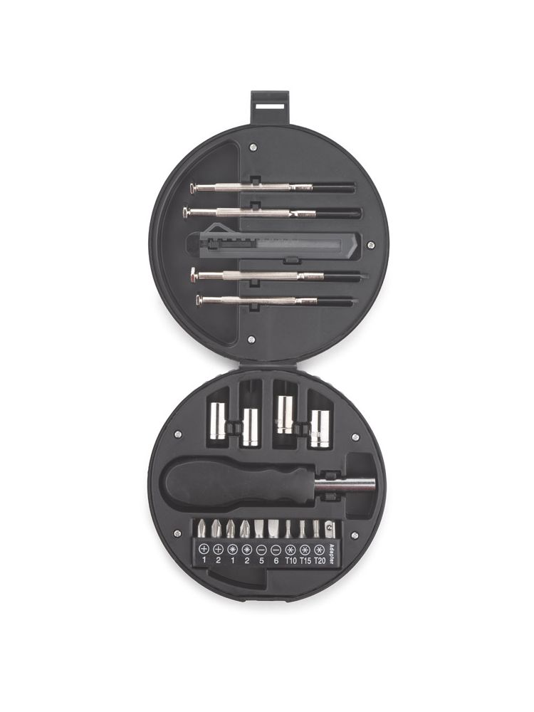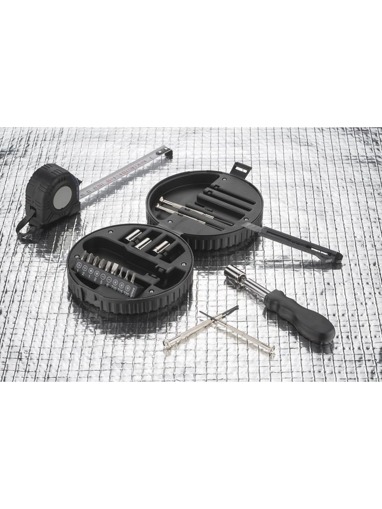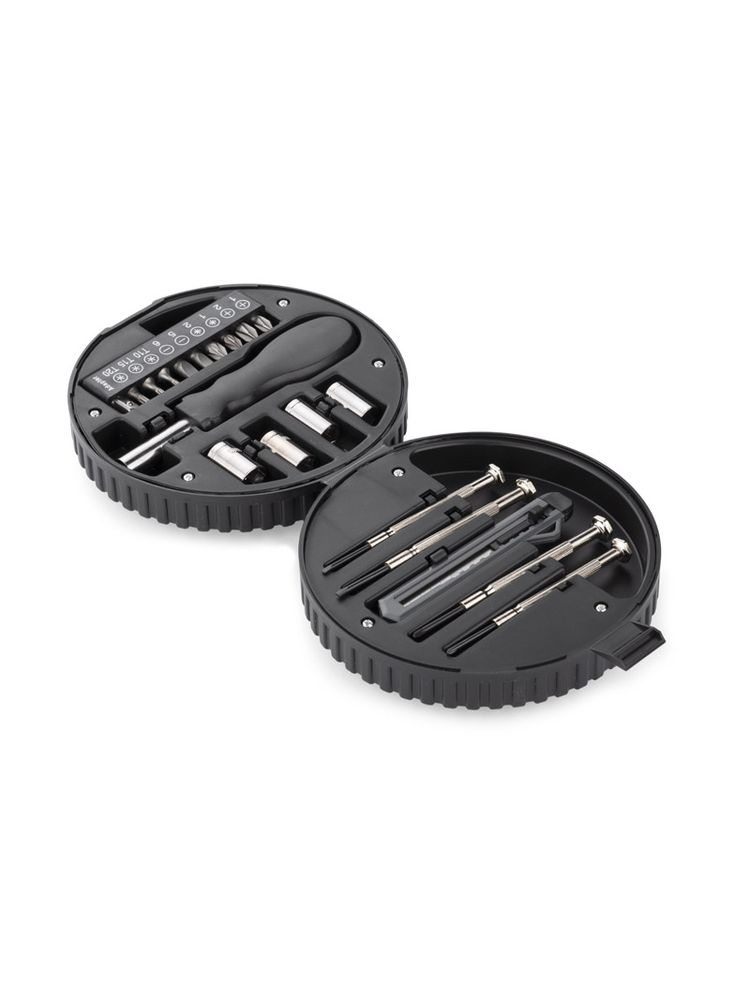 WHEEL to zestaw, w którym znajduje się wiele przydatnych narzędzi: cztery śrubokręty precyzyjne, nożyk do tapet, uchwyt, cztery klucze nasadkowe z przejściówką i dziewięć bitów. Wszystko razem zamknięte jest w charakterystyczne etui w kształcie koła samochodowego.