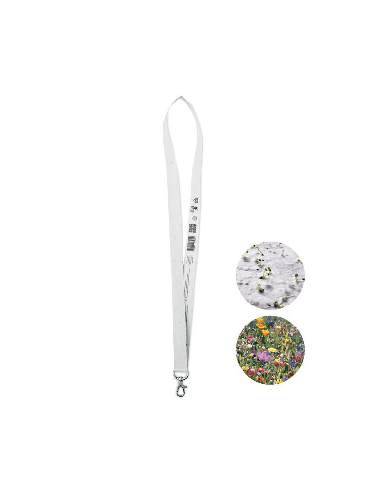 Smycz z papieru z nasionami z karabińczykiem. Nasiona dzikich kwiatów, papier z recyklingu. Szerokość 20 mm. W komplecie z metalowym karabińczykiem. Wyprodukowano w UE.