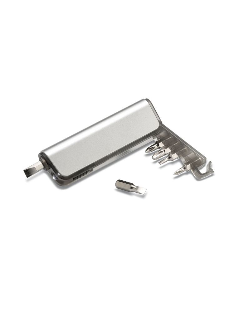 Plastikowy śrubokręt z 6 końcówkami i lampką LED. Metaliczne wykończenie. 3 baterie dołączone.