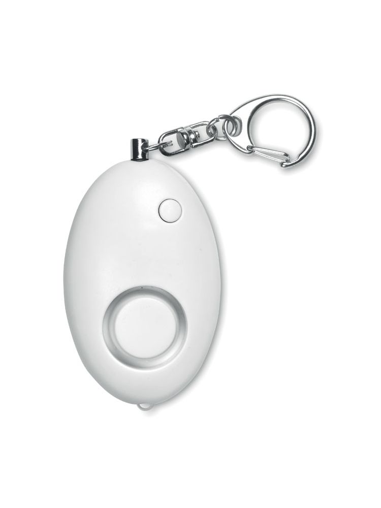 Mini alarm osobisty w obudowie z ABS. Po wyciągnięciu zawleczki aktywuje się dźwięk i sygnał LED. Dołączone 3 baterie AG13.
