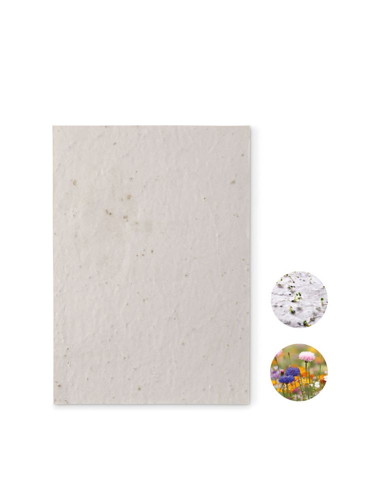Arkusz papieru z recyklingu w formacie A5 z nasionami dzikich kwiatów (80 gr/m²). Wyprodukowano w UE.