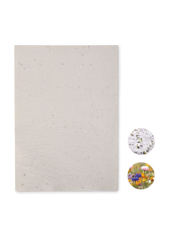 Arkusz papieru z recyklingu w formacie A4 z nasionami dzikich kwiatów (80 gr/m²). Wyprodukowano w UE.