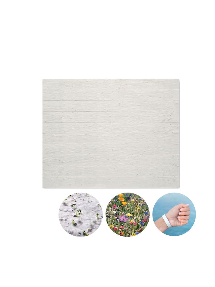 Jeden arkusz to 10 opasek eventowych. Papier makulaturowy z nasionami dzikich kwiatów. 19mm szerokości. Wyprodukowano w UE.