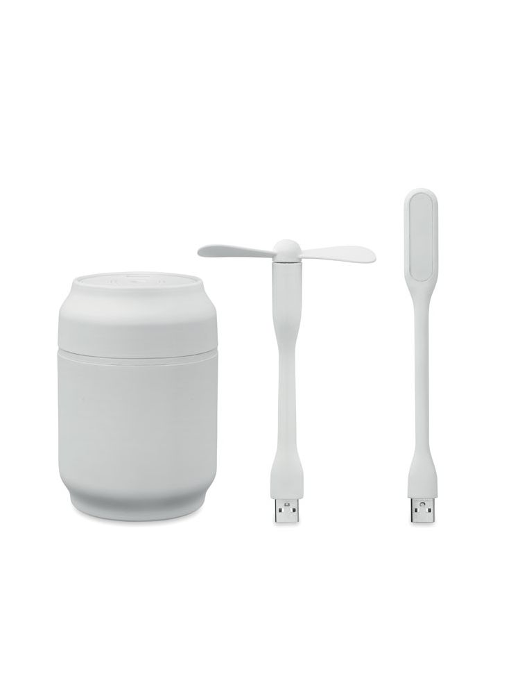 Nawilżacz 3 w 1 w kształcie puszki. Ma mini wentylator i lampkę nocną oraz 6 kolorów podświetlenia zmieniających nastrój.