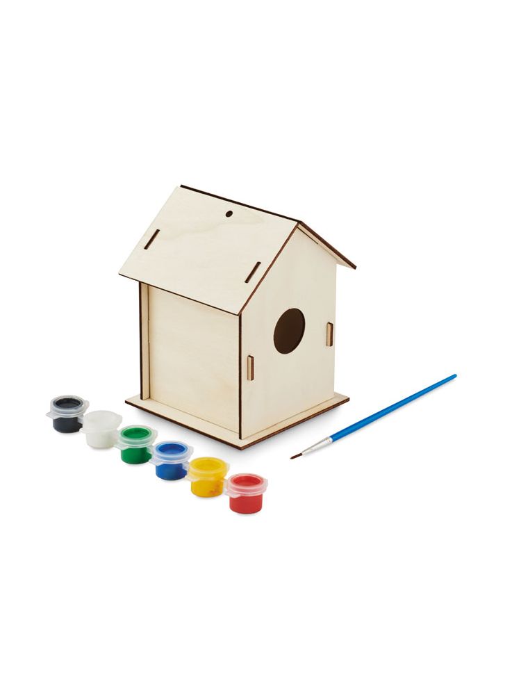 Drewniany domek dla ptaków z drewna topoli. Zawiera: 1 pędzelek i 6 pigmentów na bazie wody. Wstępnie przycięte drewniane elementy do samodzielnego montażu.