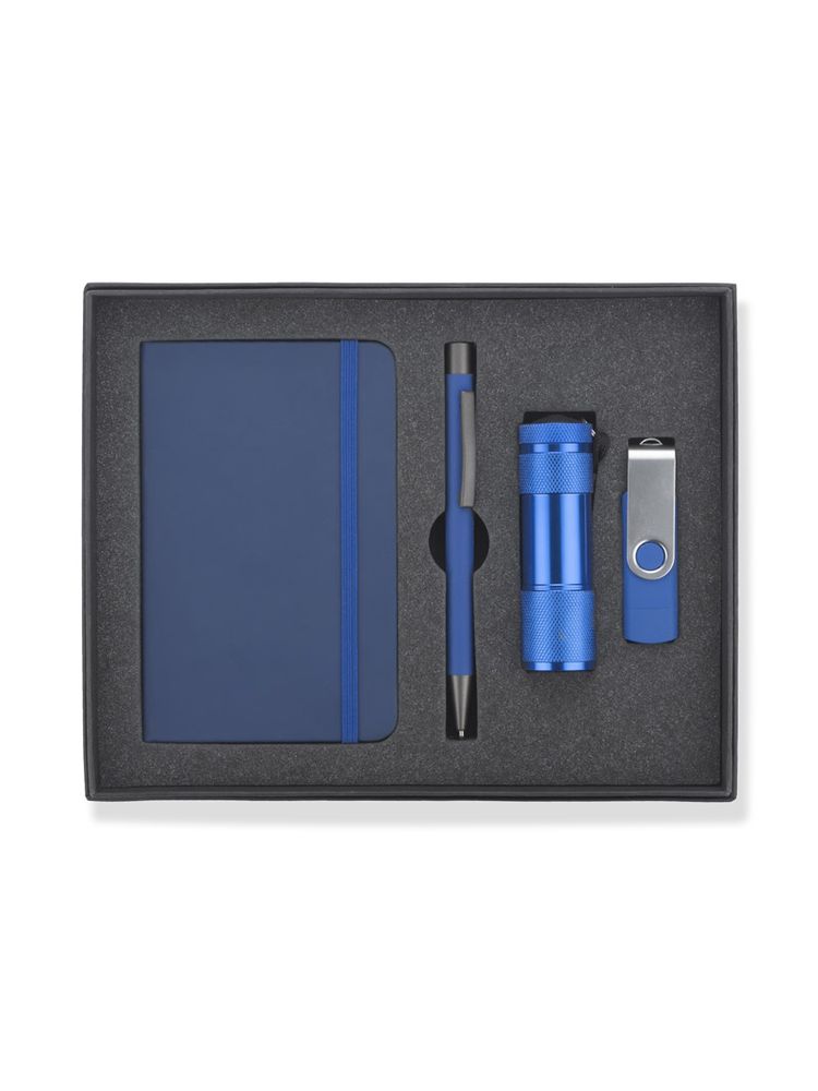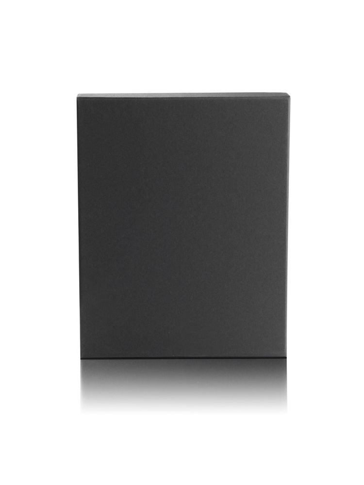Czarne pudełko wykonane z mocnego, solidnego materiału. Wewnątrz wyłożone jest pianką z miejscem na 4 produkty – notes A6, długopis, power bank oraz kabelek .
