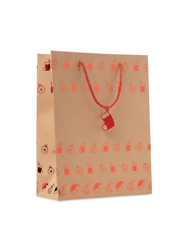 Elegancka torba papierowa z papieru kraft na prezent z sezonowym wzorem. Dołączona zawieszka. 250 gr/m².