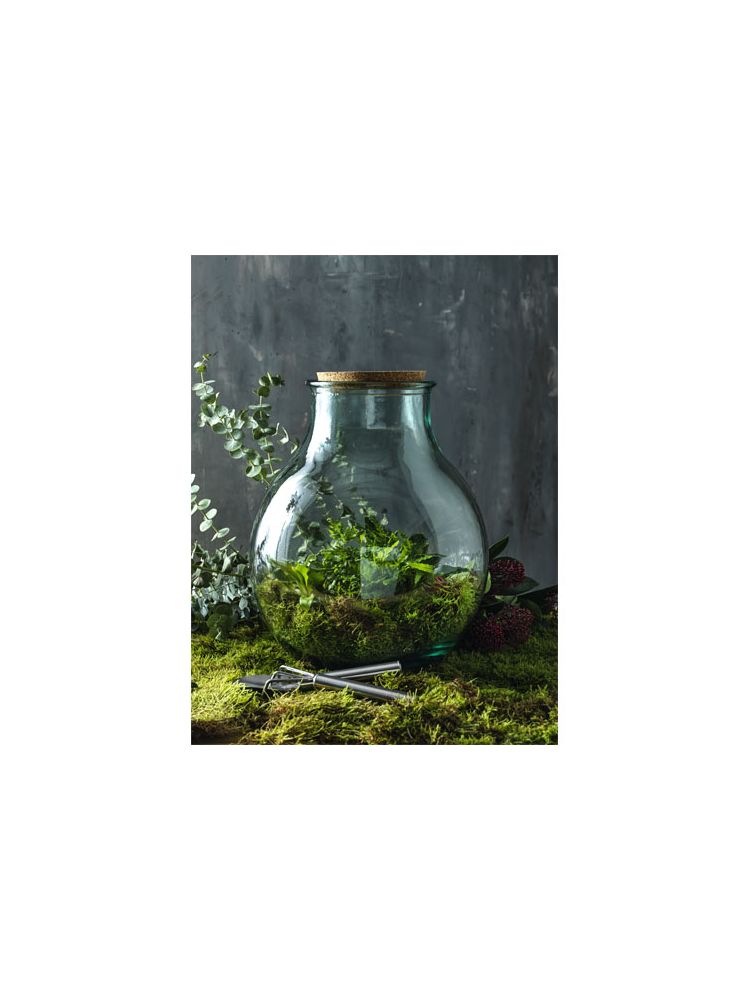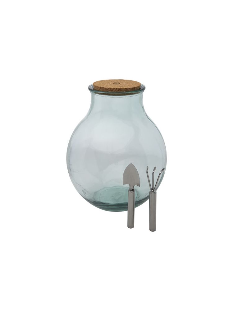 Zestaw ogrodniczy do terrarium w 100% z recyklingu, z korkiem i narzędziami ogrodniczymi ze stali nierdzewnej. Terrarium jest jak akwarium, ale dla roślin zamiast ryb. Dzięki temu możesz stworzyć własny miniaturowy ogród lub las, zamknięty w swoim małym świecie. Terrarium jest wykonane ze szklanych butelek z recyklingu. Szkło z recyklingu produkowane jest przy mniejszym zużyciu energii, surowców i dodatków, niż jest to wymagane do produkcji tradycyjnego szkła.