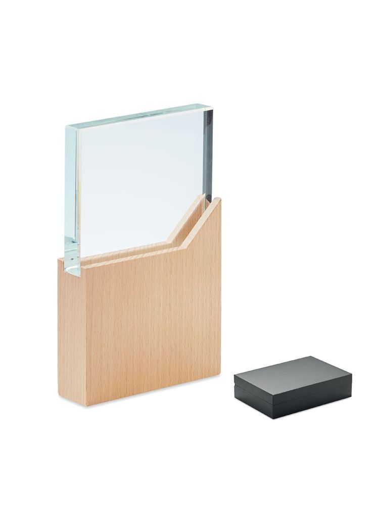 Kryształowa nagroda lub tablica pamiątkowa na drewnianej podstawie z drewna bukowego, w pudełku upominkowym.