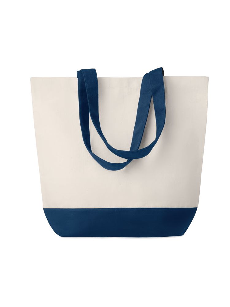 Płócienna torba na zakupy o gramaturze 280gr/m² z kolorowymi detalami na dole i pasującymi uchwytami (posiada wewnętrzną kieszeń ).