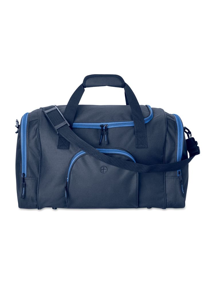 Torba sportowa z kieszeniami na suwak: 2 boczne i przednia z wejściem na słuchawki. Materiał: poliestr 600D. W komplecie odpinany i regulowany pasek na ramię.