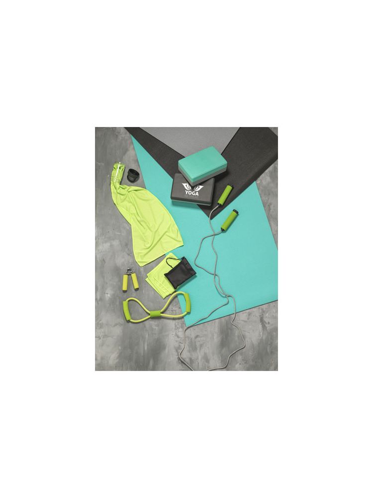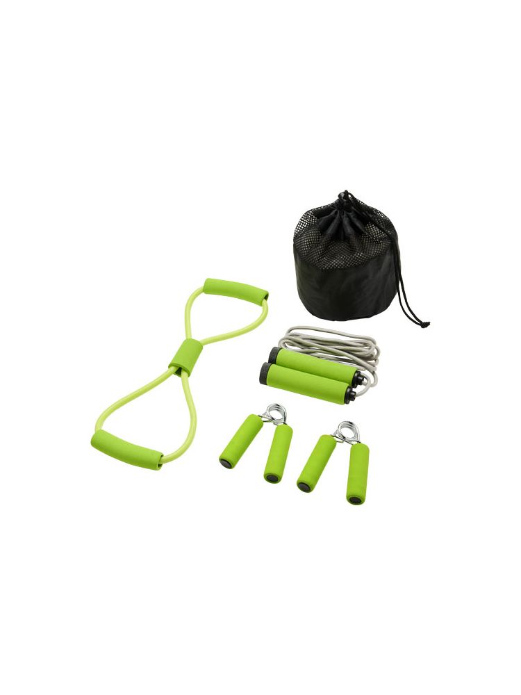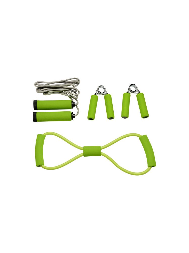 Zestaw fitness z wszystkimi przyborami potrzebnymi do perfekcyjnego treningu. Dwa ściskacze ręczne, skakanka i ekspander do ćwiczeń klatki piersiowej w pasującym kolorze. Dostarczany w siatkowym pokrowcu ułatwiającym przenoszenie, posiada dużą powierzchnię na dekoracje.