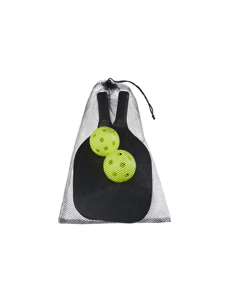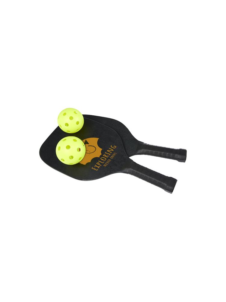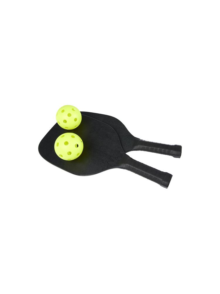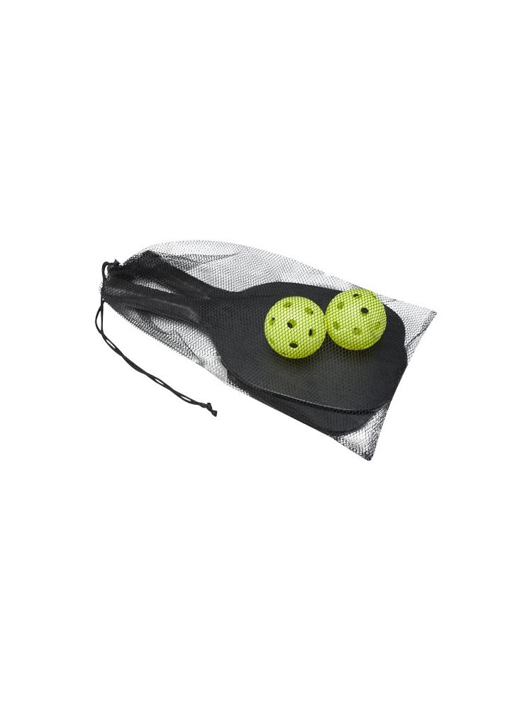 Ten zestaw rakietek wykonany z drewna bukowego zapewnia mnóstwo zabawy i ruchu dla dwojga na plaży, w parku lub w ogrodzie. Rakietki mają wymiary 40 × 20 × 0,7 cm i są pomalowane na czarny kolor, co zapewnia dużą powierzchnię do nadruku dowolnego logo. Uchwyty są oklejone taśmą PU, co zapewnia maksymalną przyczepność podczas intensywnej gry. Zestaw uzupełniają 2 piłeczki wykonane z tworzywa PP, zapakowane w siatkowe etui z poliestru o wymiarach 45 × 26 cm. Ostrzeżenie! Nieodpowiednie dla dzieci poniżej trzeciego roku życia. Małe części. Ryzyko zadławienia.