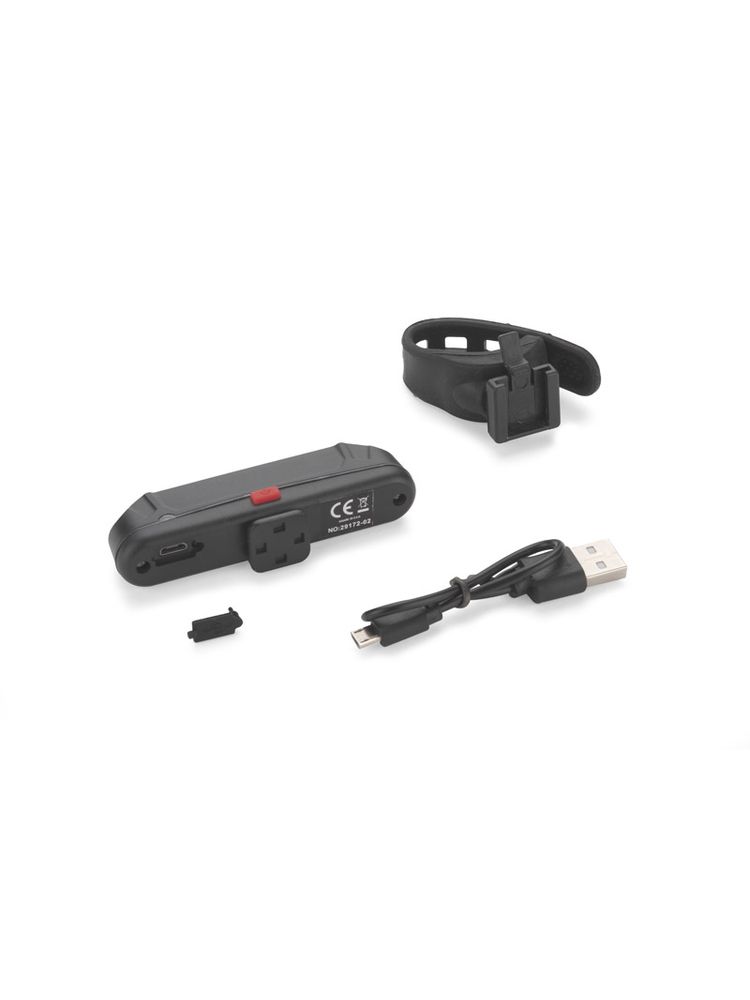 Lampka rowerowa FARO to świetny gadżet dla rowerzystów. Wyposażona jest w diody LEDCOB i wbudowany akumulator o pojemności 500 mAh. Posiada pięć trybów działania: czerwone i białe światło stałe, dwa tryby światła czerwonego migającego oraz światło czerwone i białe migające naprzemiennie. Dzięki temu może być wykorzystana zarówno jako lampka przednia, jak i tylna. W zestawie dołączony kabel micro USB do ładowania. Posiada wygodny silikonowy uchwyt.
