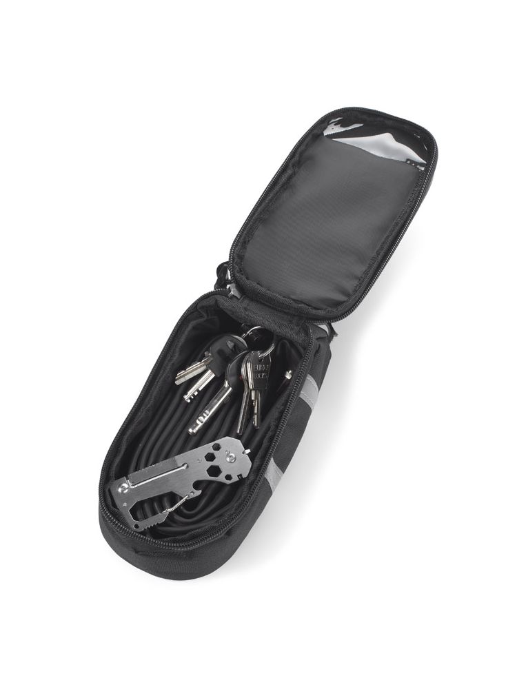 Torebka rowerowa BAS to rozwiązanie bardzo przydatne dla cyklistów. Zmieści kilka niezbędnych podczas jazdy drobiazgów i zapewni wygodny do nich dostęp. Z przodu kieszonka z folią dotykową na smartfon. Bezpieczne mocowanie na ramie rowerowej za pomocą 3 uchwytów na rzepy. Torebka z obu stron posiada niewielkie odblaskowe paski.