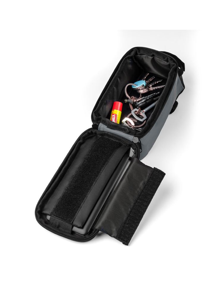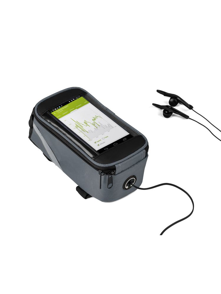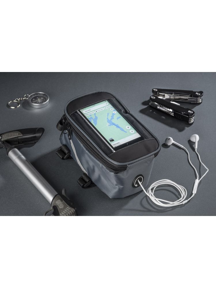 Solidnie mocowana do ramy torba rowerowa posiada pojemną, zapinaną na zamek komorę na drobne przedmioty. Dodatkowo w torbie VELO znajduje się wyjście na słuchawki oraz kieszonka z folią dotykową na smartfona, która umożliwia korzystanie z telefonu bez konieczności wyciągania go z torby. Spoglądanie na nawigację czy sterowanie odtwarzaczem muzyki nie stanowi żadnego problemu, nawet podczas jazdy na rowerze.
