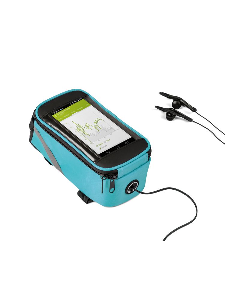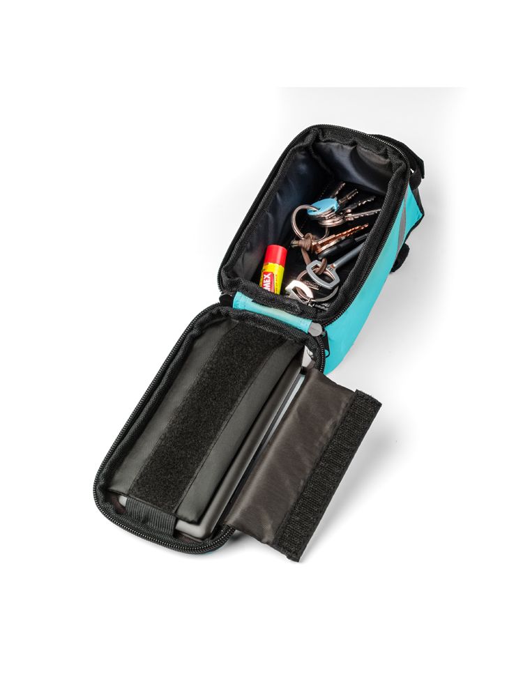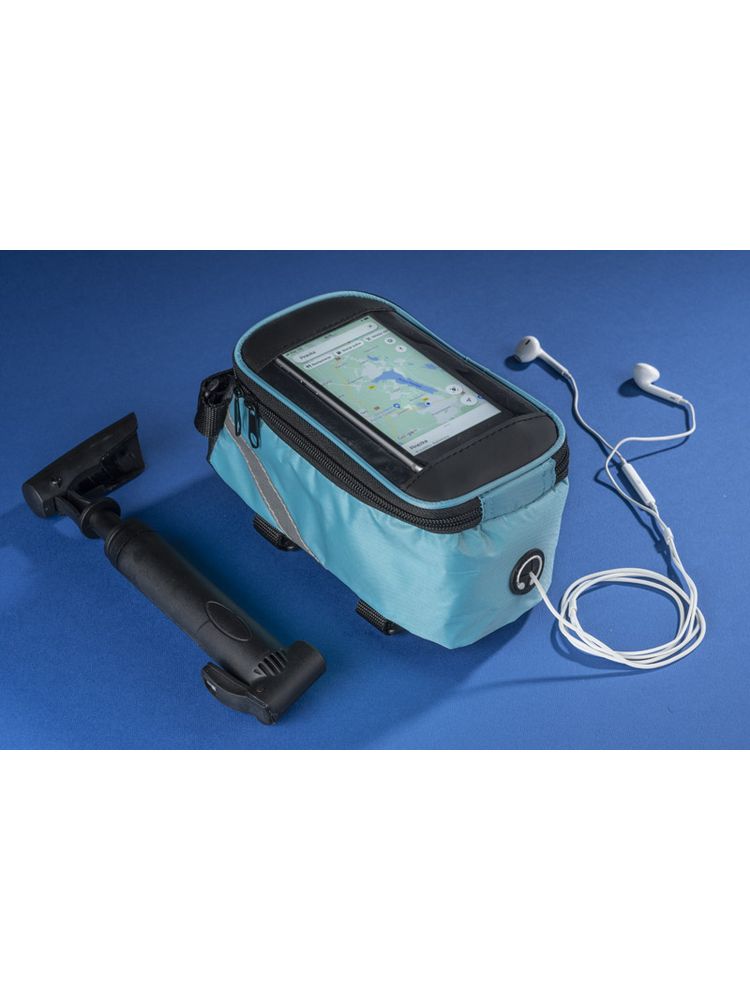 Solidnie mocowana do ramy torba rowerowa posiada pojemną, zapinaną na zamek komorę na drobne przedmioty. Dodatkowo w torbie VELO znajduje się wyjście na słuchawki oraz kieszonka z folią dotykową na smartfona, która umożliwia korzystanie z telefonu bez konieczności wyciągania go z torby. Spoglądanie na nawigację czy sterowanie odtwarzaczem muzyki nie stanowi żadnego problemu, nawet podczas jazdy na rowerze.
