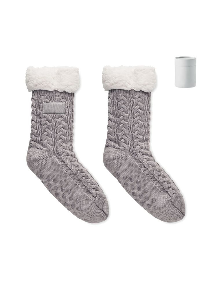 Para skarpet kapciowych z antypoślizgowymi elementami, wykonana z akrylowego sznurka, z podszewką z futerka sherpa o grubości 240 gr/m². Zapakowana w pudełko upominkowe. Rozmiar L= 40-43.