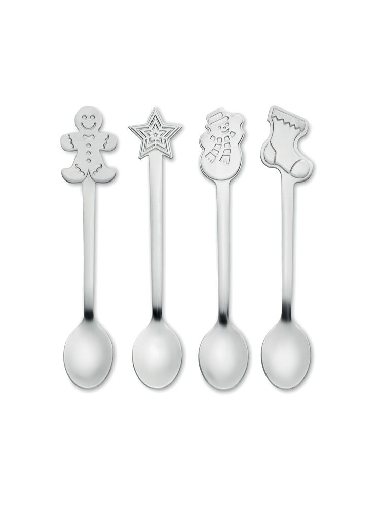 Zestaw 4 różnych łyżeczek do herbaty z motywem świątecznym ze stali nierdzewnej. Prezentowane w pudełku upominkowym.