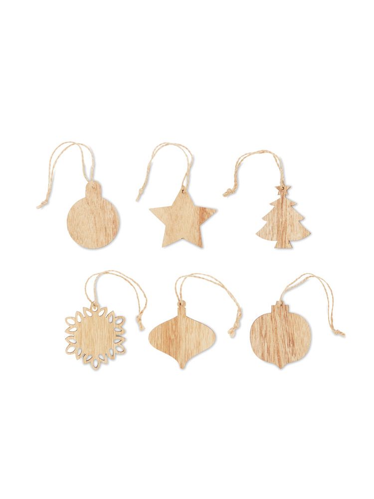 Zestaw 6 drewnianych ozdób świątecznych z drewna bukowego z jutowym sznurkiem. Pakowane w pudełko typu kraft.