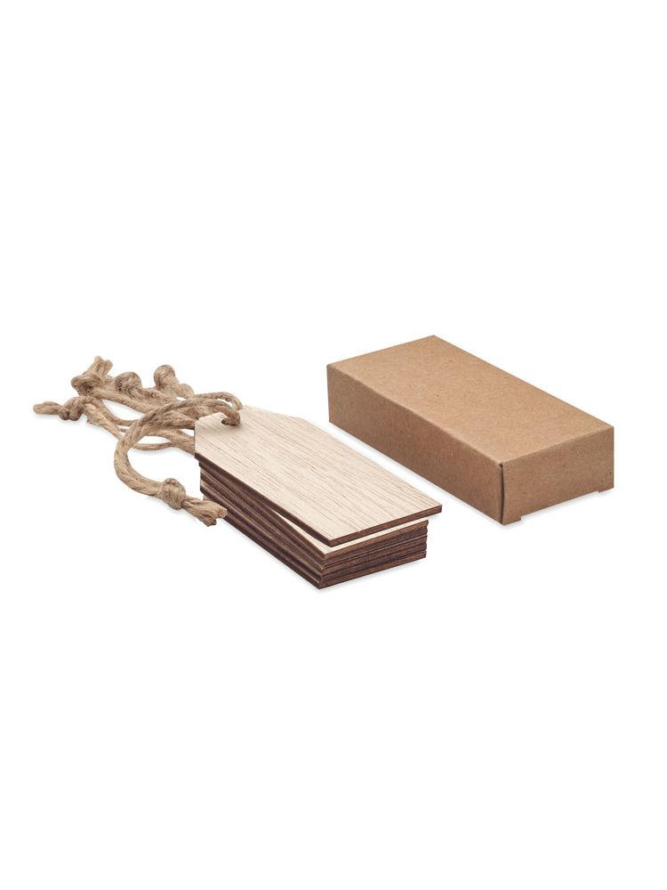 Zestaw 6 drewnianych zawieszek na prezenty z jutowym sznurkiem, w pudełku z tworzywa sztucznego.