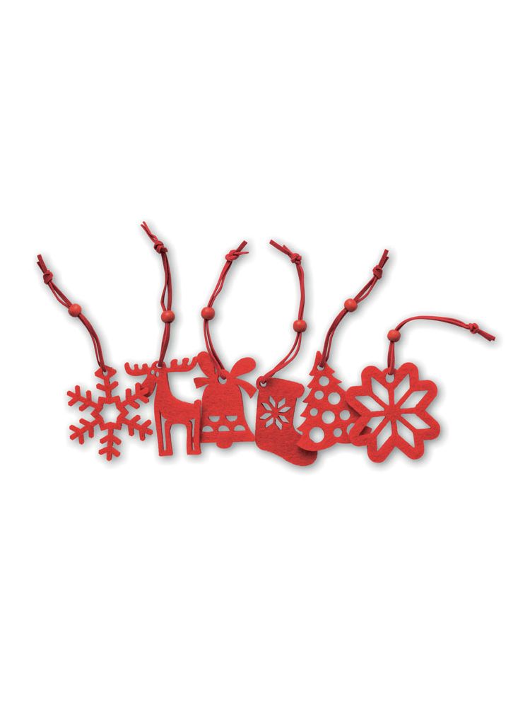 Komplet 6 czerwonych filcowych zawieszek na choinkę. 6 różnych wzorów: choinka, płatek śniegu, dzwonek, but na prezenty, poinsecja i renifer.