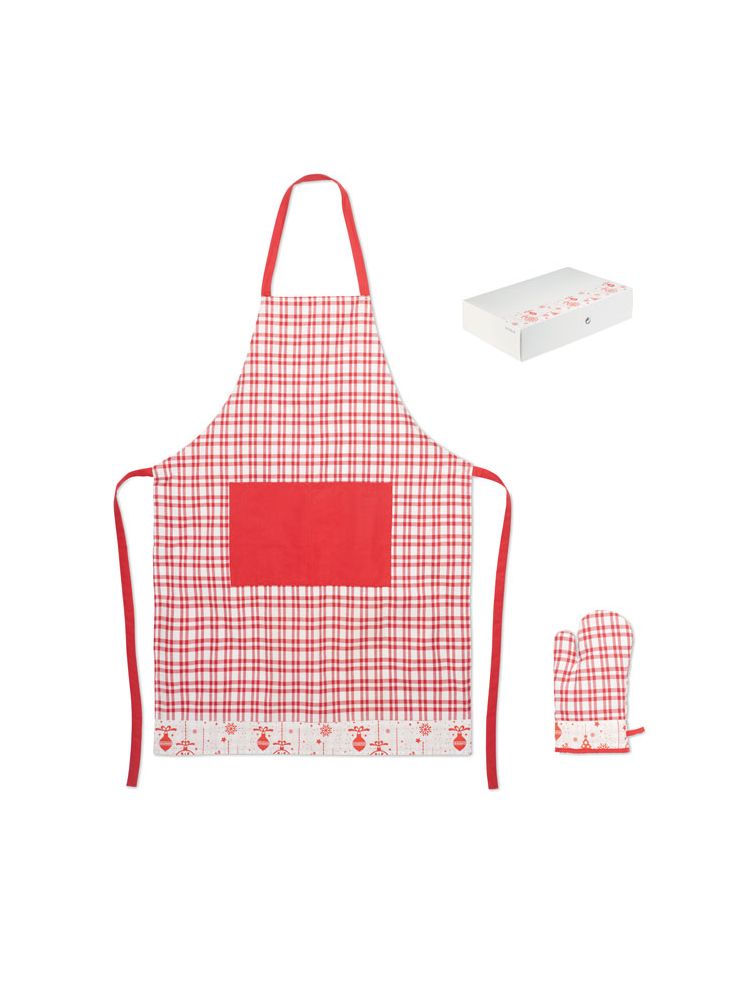 Zestaw kuchenny z bożonarodzeniowym wzorem z bawełny 200 gr/m². W zestawie fartuch i rękowawice kuchenne. Zapakowany w pudełko.