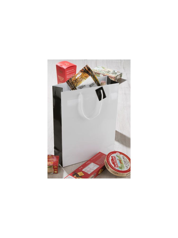 UWAGA, ograniczona liczba kolorów przy znakowaniu techniką sitodruku.Uniwersalna torba papierowa do pakowania prezentów będzie pięknym opakowaniem nie tylko świątecznych upominków. Posiada eleganckie czarne boki, które są jej dodatkową ozdobą. Torba z rączkami ze sznurka, do rączek dołączony bilecik, na którym można wydrukować logo lub wpisać własny tekst życzeń. Gramatura papieru 157 gsm.